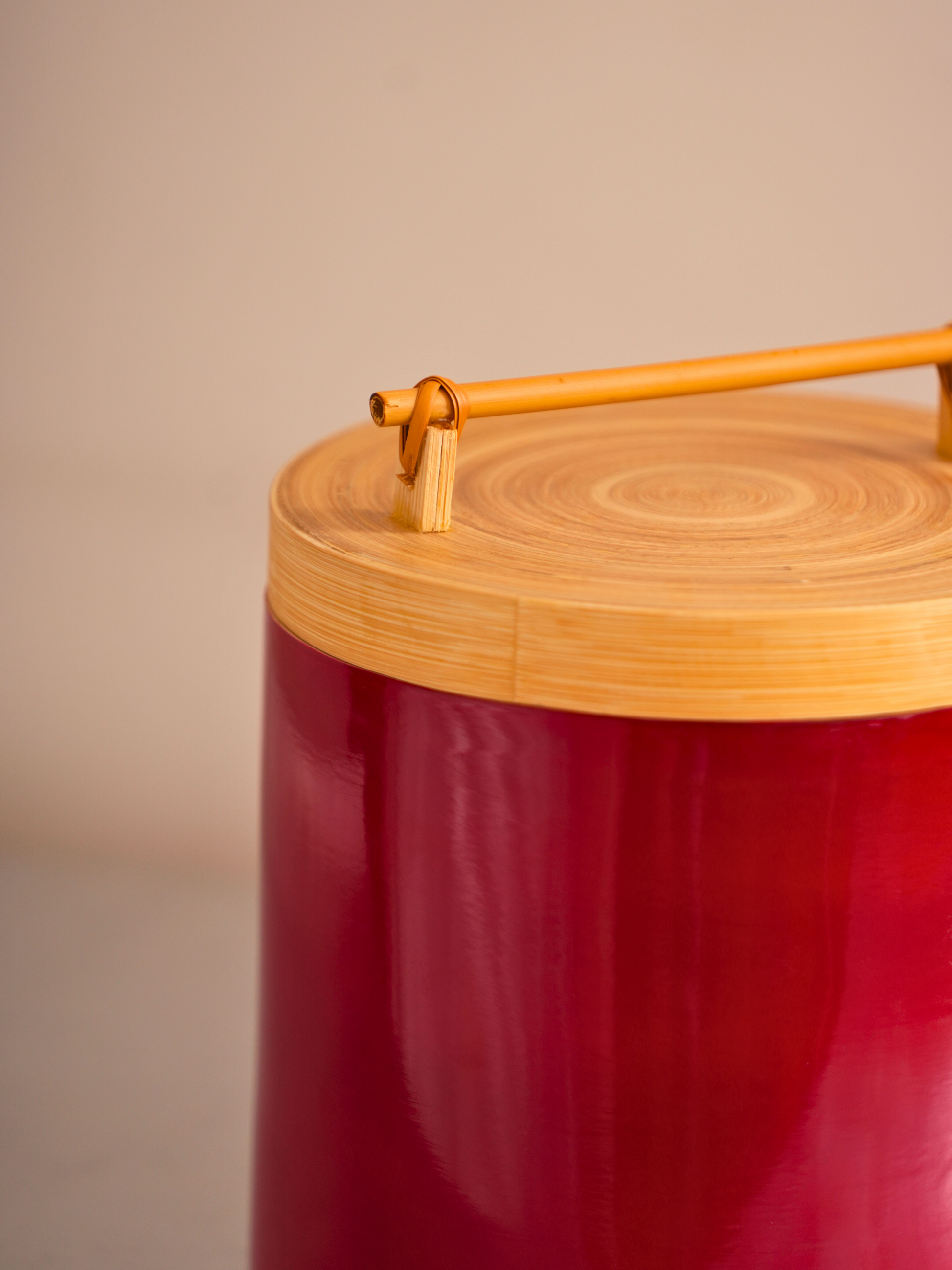 This exquisite red lacquer and bamboo cannister is a luxurious addition to any home decor. Crafted with precision and attention to detail, it not only adds a touch of sophistication but also provides functional storage for various items. Elevate your living space with this exclusive piece.