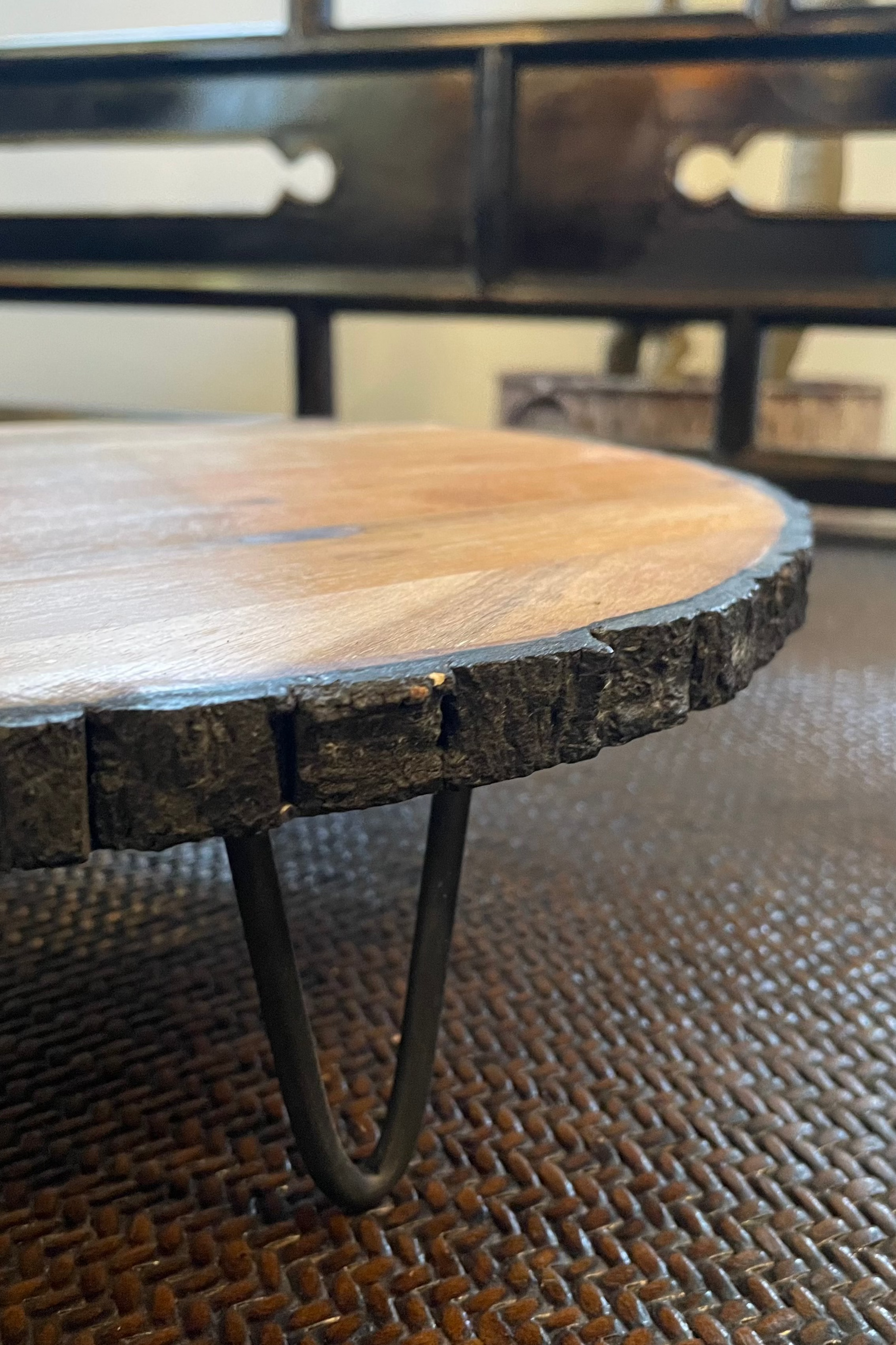 Elevate your culinary creations with our stunning wooden cake/trivet stand. Its unique raw edges and short metal legs add a charming rustic touch to any table setting. Perfect for serving up delicious cakes or protecting your table from hot dishes. Indulge in the art of stylish entertaining with this exquisite stand.